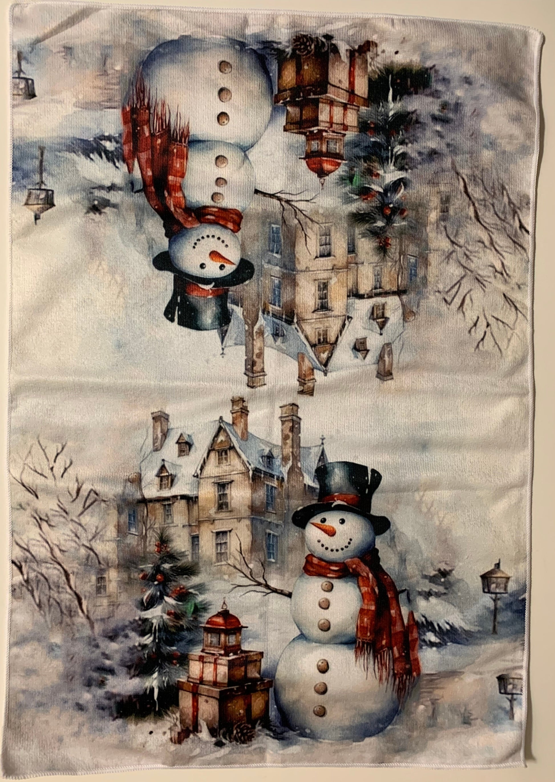 Smukt jule håndklæde med snemand ved villaen i sneen som passer på julegaverne.