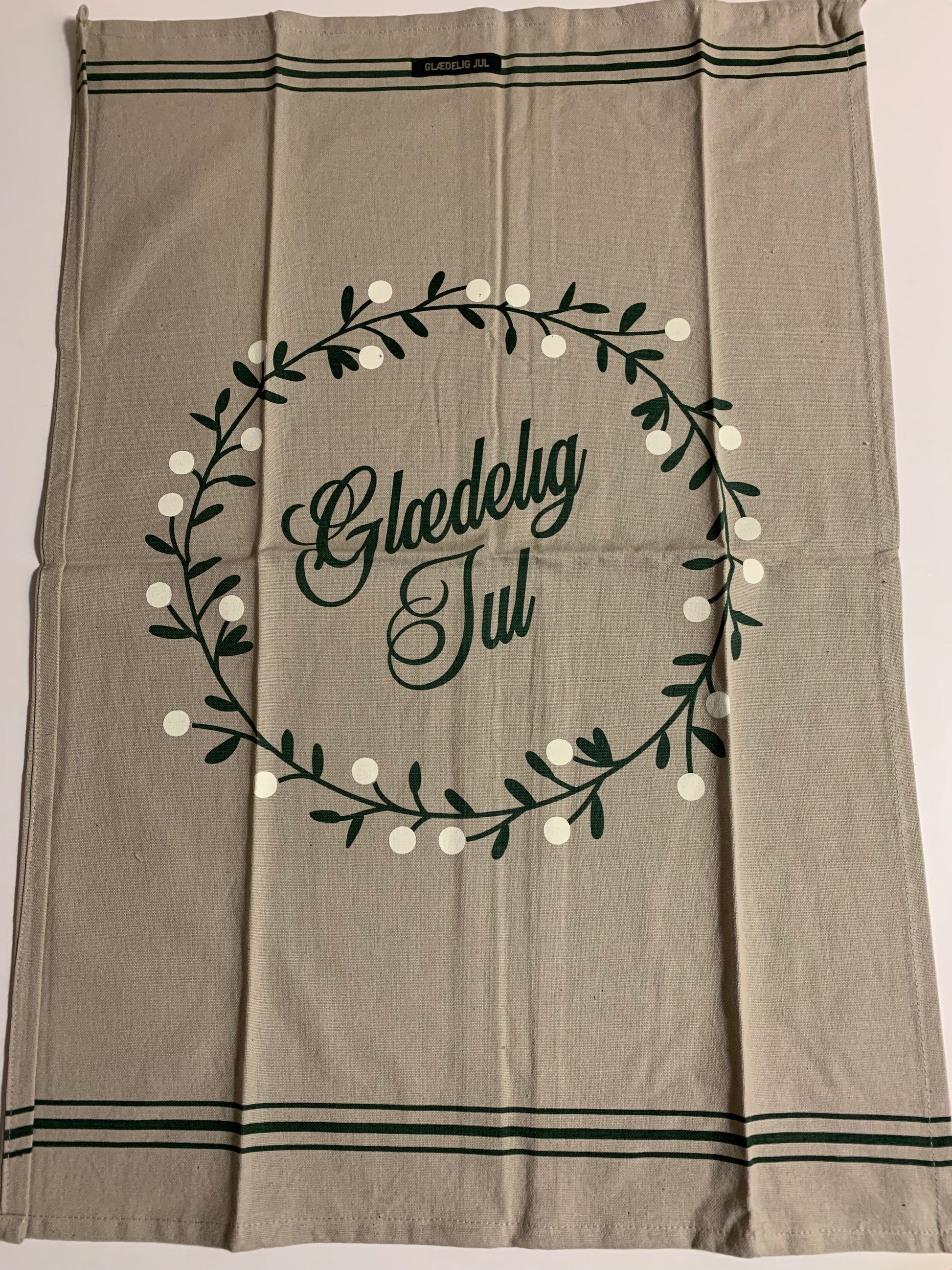 Smukt jule viskestykke med mistelten ring med Glædelig Jul.
